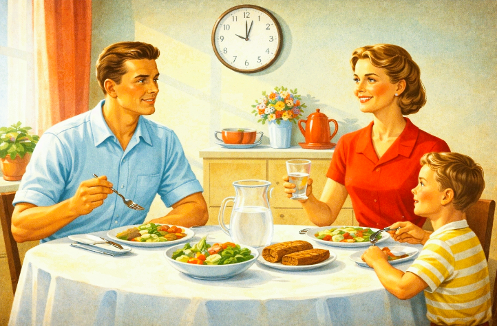 В СССР не было понятия «постоянно что-то жевать». Завтрак в семь утра, обед в час дня, ужин в семь вечера — и точка. Никаких яблок в десять, орешков в три, йогуртов в пять. Между приёмами пищи проходило по пять часов, и ничего — люди не падали в обморок от голода. Наоборот, были бодрые и стройные.